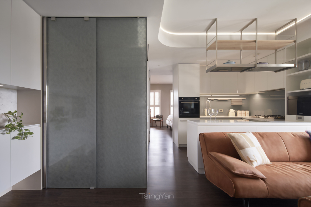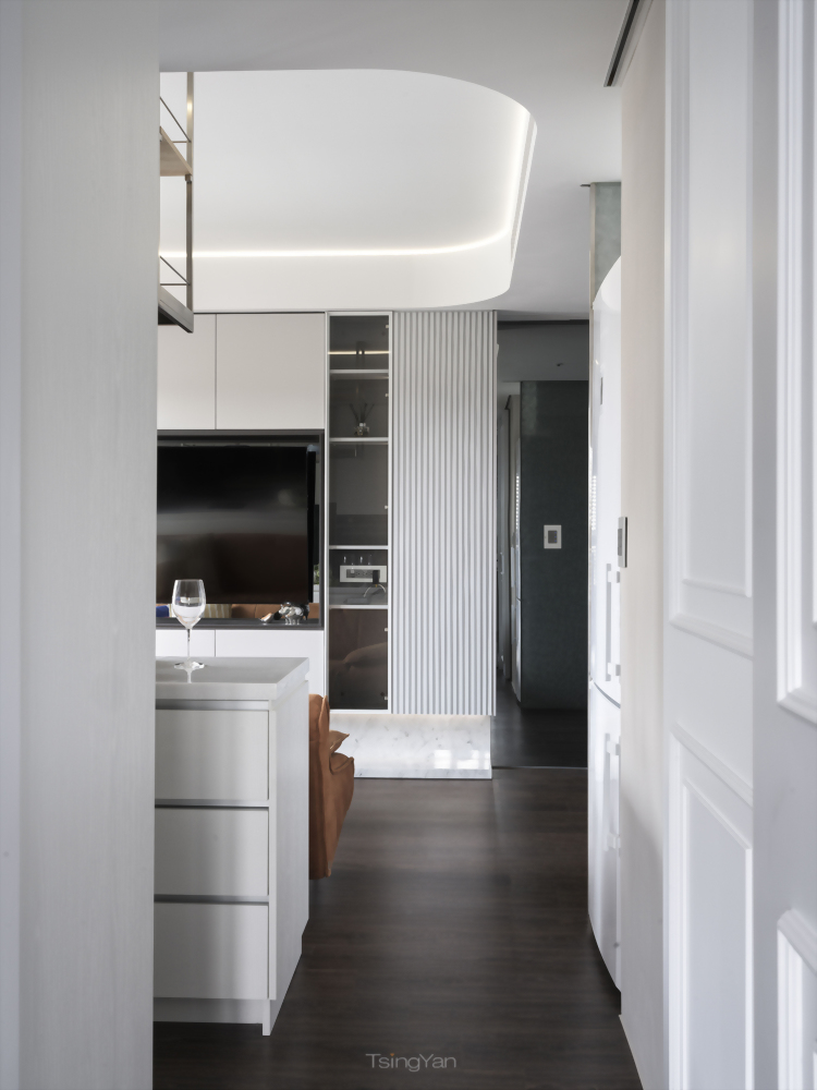 白色系ㄇ型廚房隱藏著Miele微波爐、洗碗機及烤箱