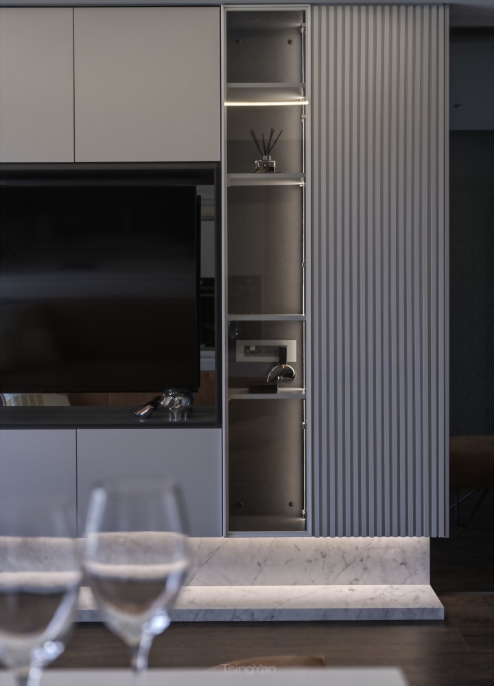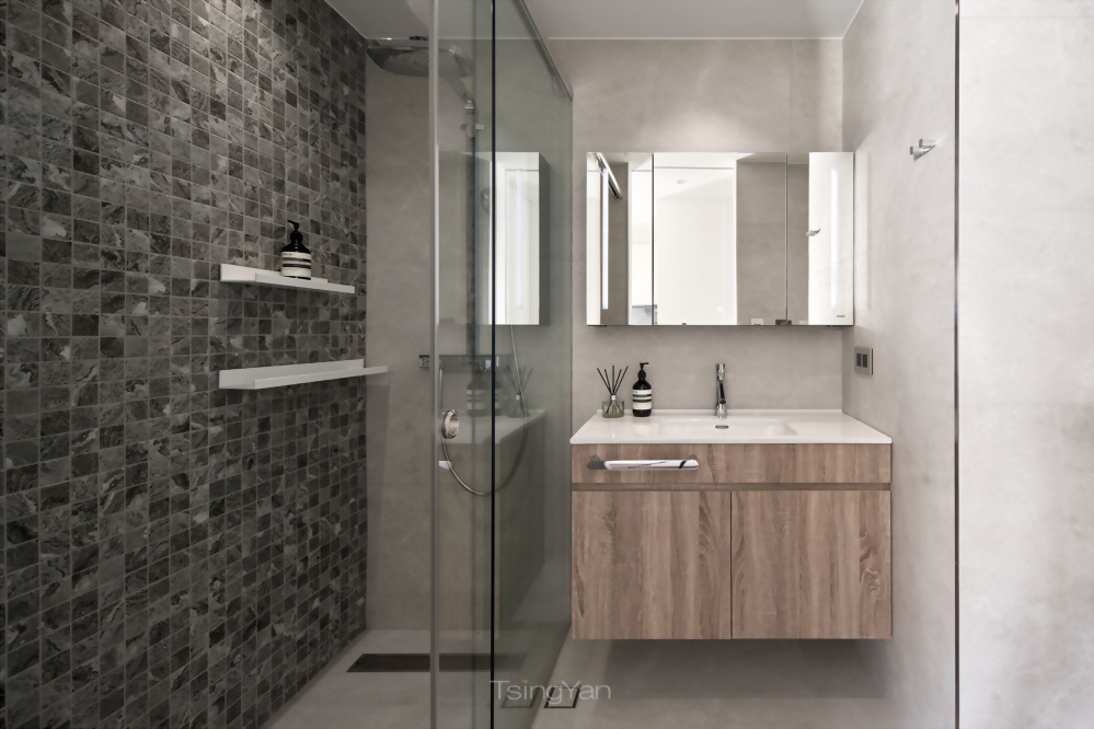 紋理綿延至壁面瓷磚上 收尾在雲紋馬賽克磁磚中