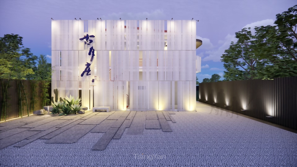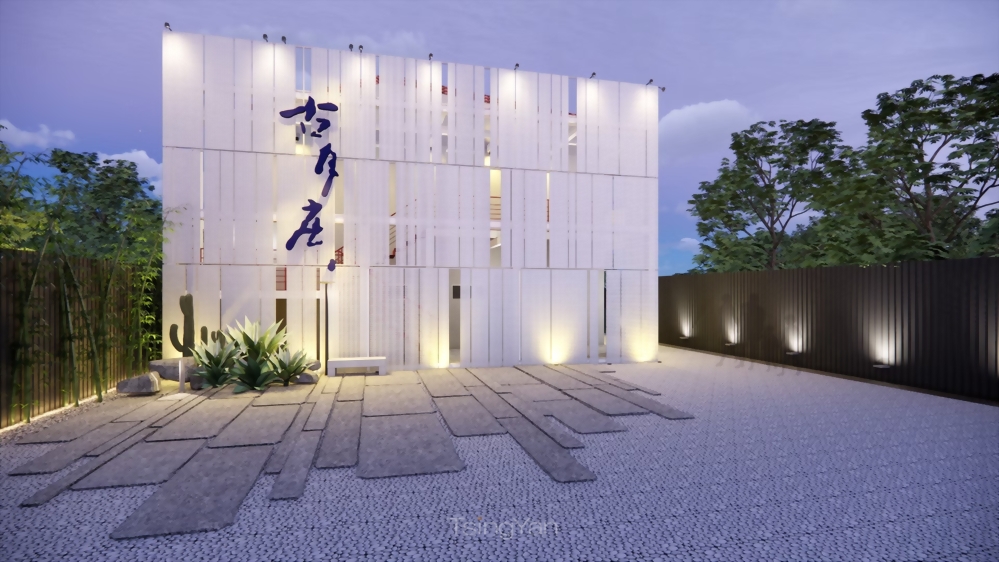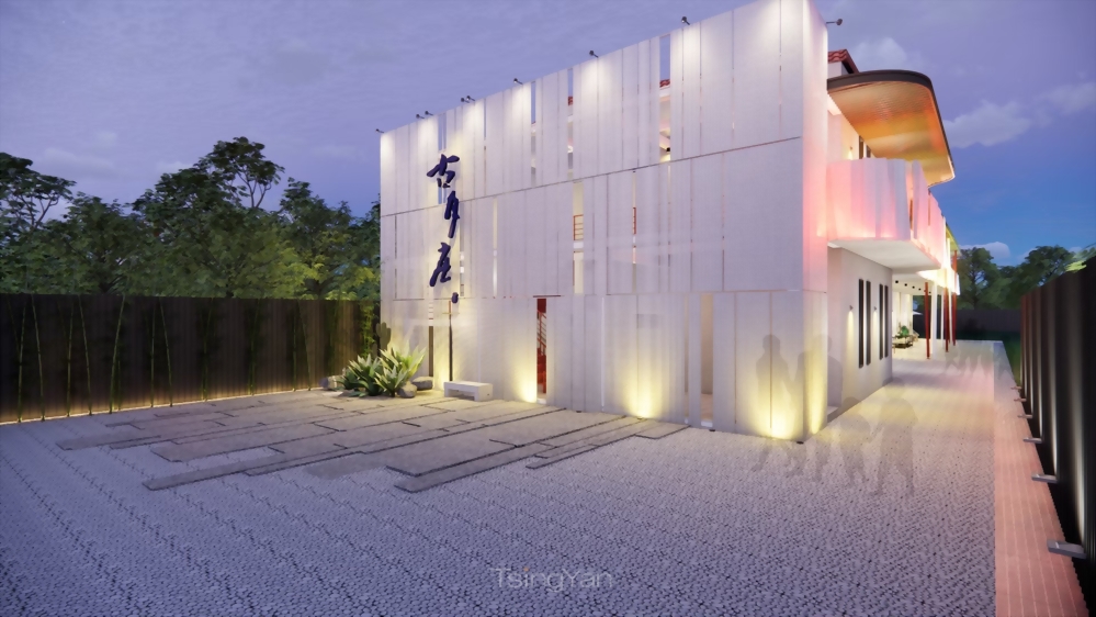 以"光影"為主題,古月庄的立面設計透過垂直格柵的層次語彙,展現出現代簡約中帶有東方意境的氣韻。白色立面在光影變化中產生細膩的節奏,象徵時間的流轉與自然的呼吸。前方鋪面的錯落設計呼應山林地貌,搭配竹與仙人掌等植栽,營造出純淨、沉靜而具詩意的場域氛圍,使建築成為自然與人文之間的柔性連結。